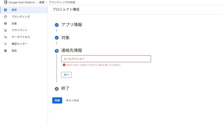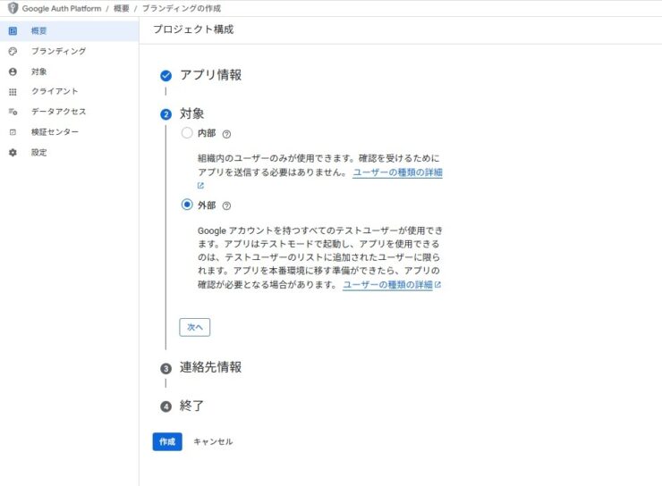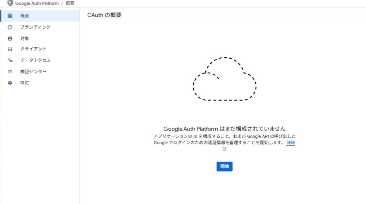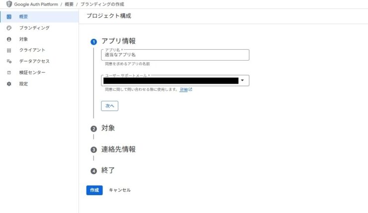 Google Auth Platformの構成画面になります。Google Cloudのプロジェクト単位で作成する形になります。