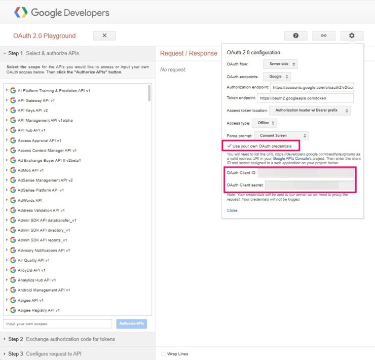 右上の ⚙️ 設定 で “Use your own OAuth credentials” をオンにして、先ほど作った Client ID / Client Secret を入力 → Close。