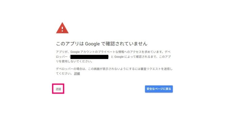 アカウント選択後、「このアプリはGoogleで確認されていません」と表示されますが、左下の詳細から進み、URLへアクセスします。