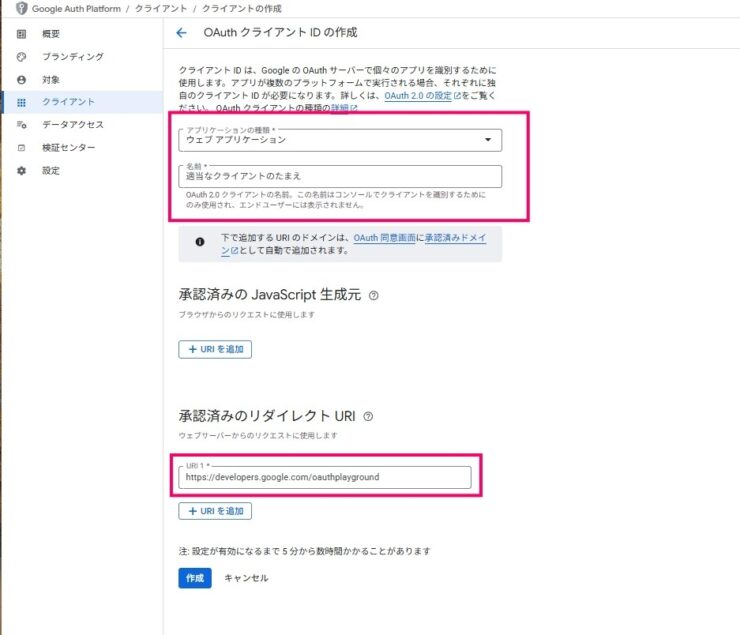 OAuth クライアント IDを作成します。